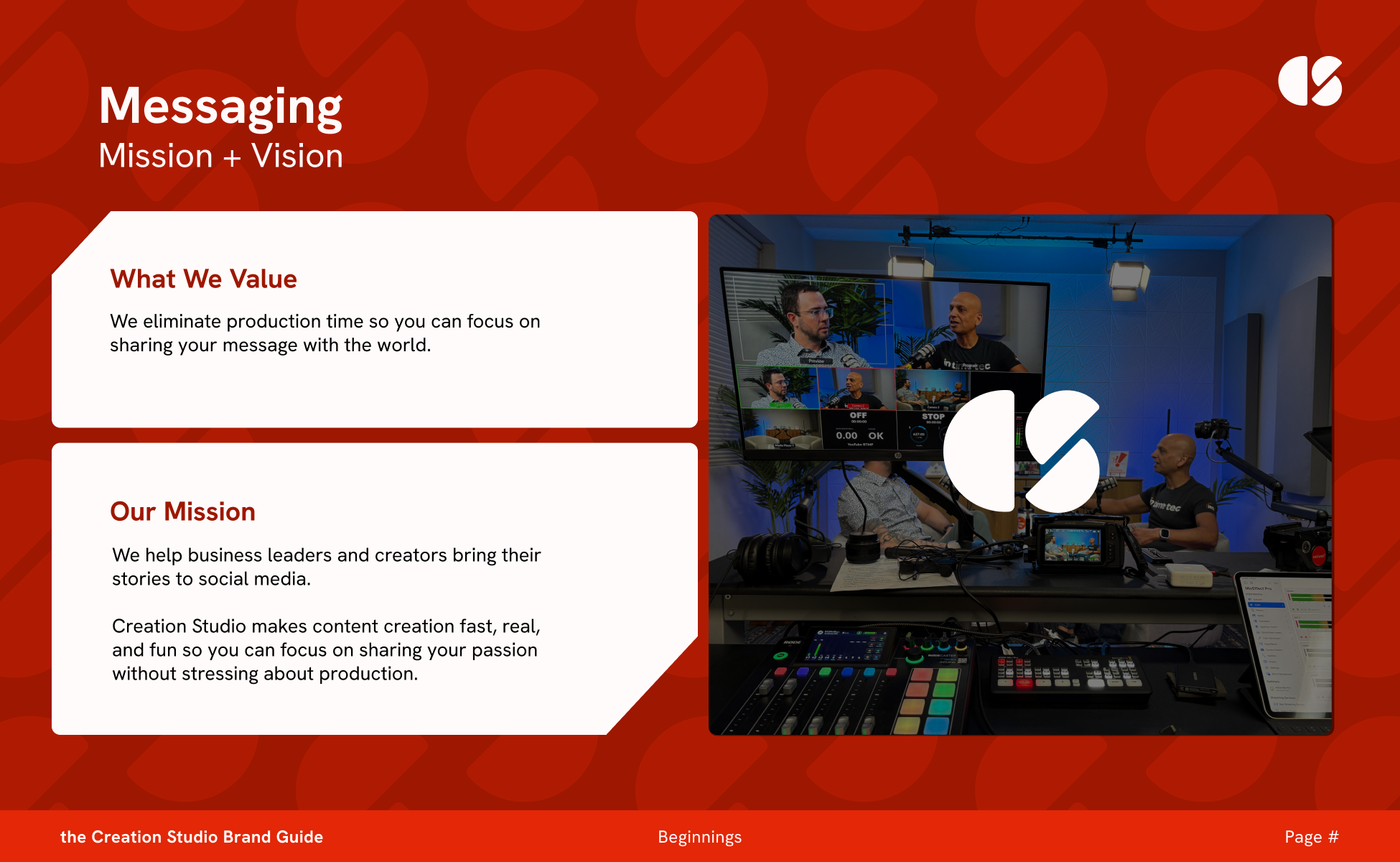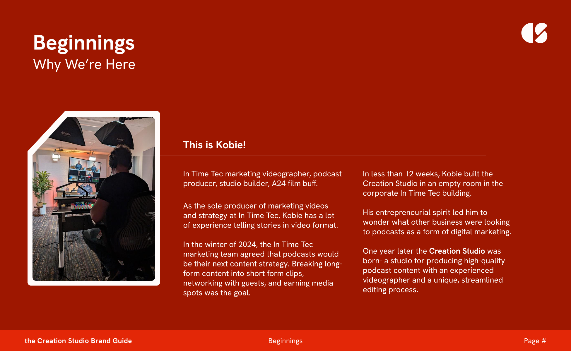 My good friend and coworker, Kobie, is an entrepreneur. His latest idea was to build a podcast studio for marketing efforts and sell the space to clients. Within 8 weeks of his idea, he had built a studio in our office building and was ready to develop his business plan. I came along with him to define his target audience and create a brand that would speak to his customer base while standing out in a lineup of other successful podcast studios in the Boise area.
